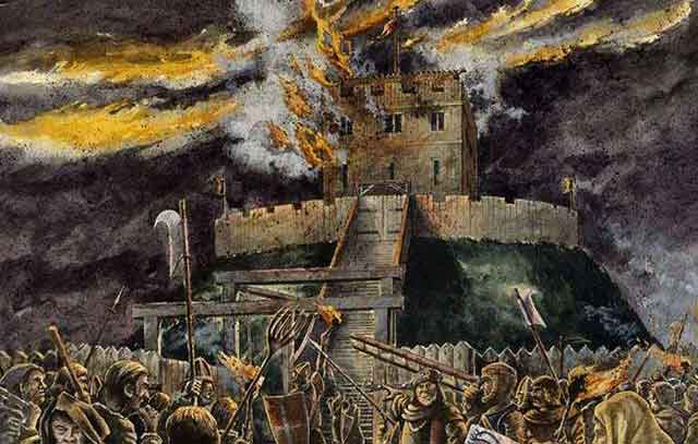 On 25 June 1266 an all-out siege began. The king’s stone-throwing machines, erected all around the castle, bombarded it with a continuous stream of missiles. They were thwarted, however, by the superior range of the weaponry inside – one chronicler described the stone projectiles from the two sides ‘clashing in the air’. The king had to send to London for larger machines. One of his wooden siege towers, apparently containing 200 crossbowmen and attached to the walls of the castle, was rendered useless by a well-aimed missile.