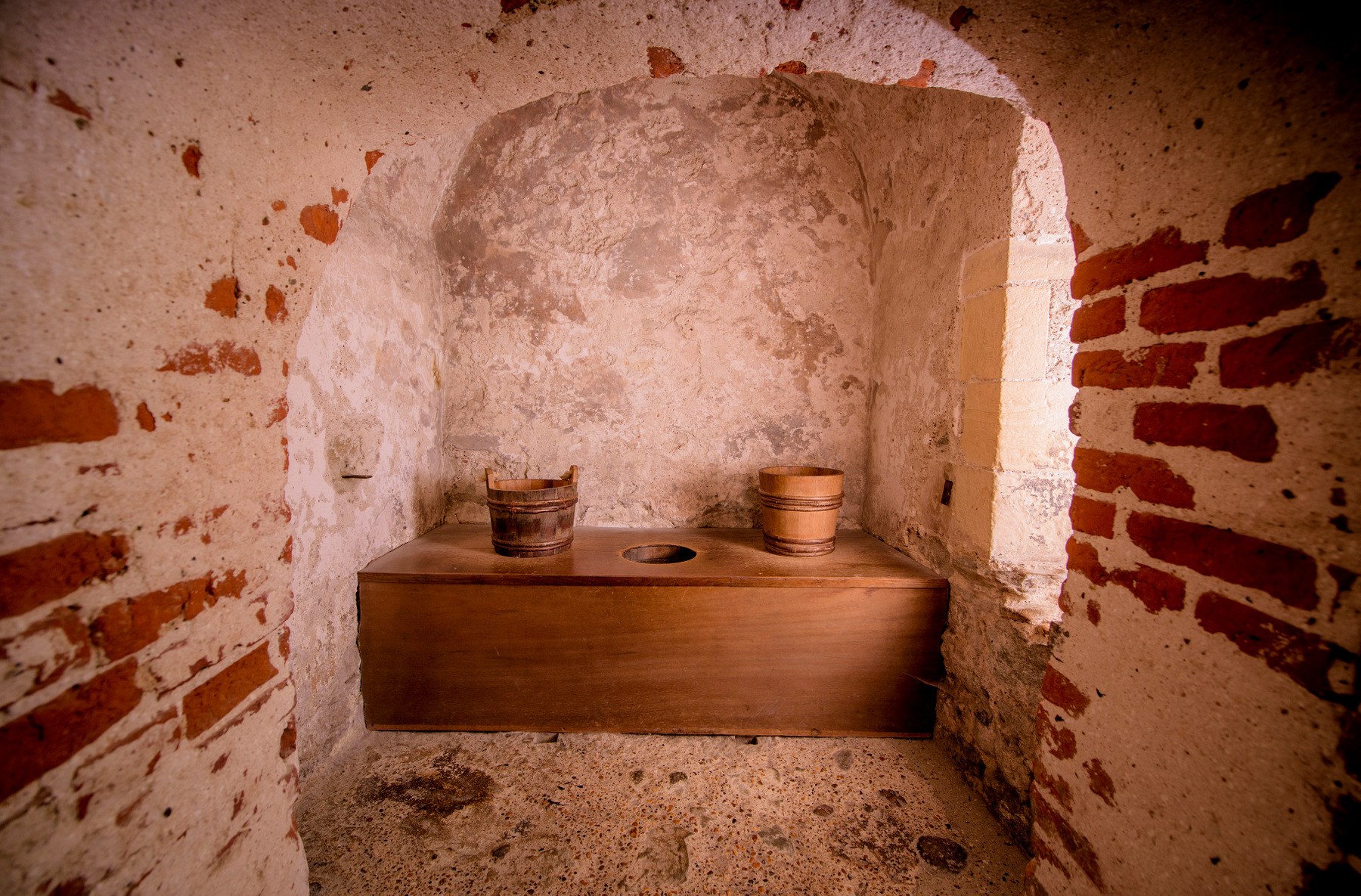 As at Peveril Castle, you'll often find loos set high up on the wall; well above the smell, and safe from attackers who might use the hole to get into the castle. Lords' rooms usually had their own private loos, and in Goodrich Castle and Middleham Castle, there were also multi-seater public gongs, where you could chat as you used them.