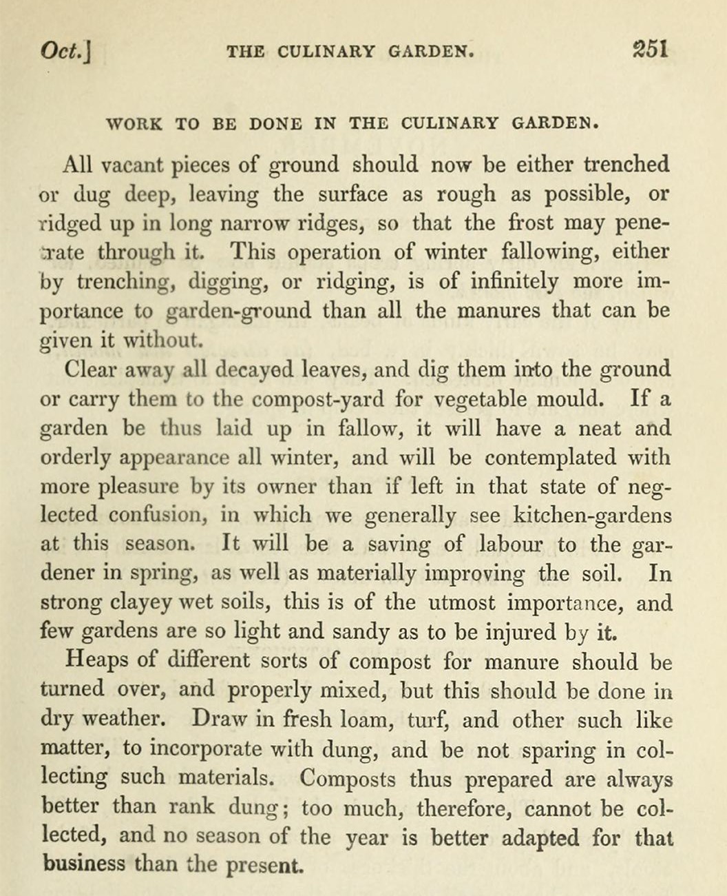 In the 19th century compost was usually homemade from many different components, including decayed leaves, dung, loam, sand, charcoal, gravel and bones. Gardeners were often secretive about their exact recipe.