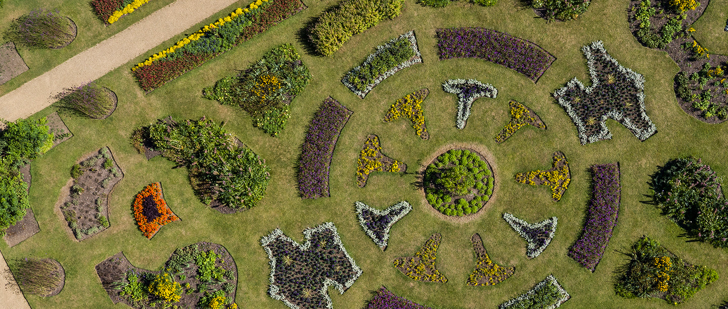 This elaborate garden was intended to be viewed from above, especially from the ballroom windows of the house.The intricate design was laid out with small clipped box plants and filled with coloured gravels and flowers to create a ‘parterre de broderie’.