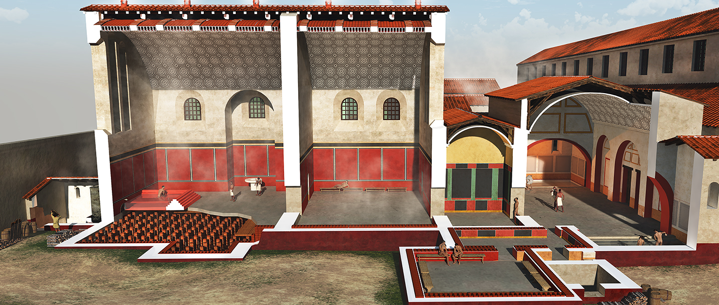 Header image: A reconstruction of the main bathing suite at Wroxeter in about AD 200 © Historic England/English Heritage Trust (illustration by Mikko Kriek)