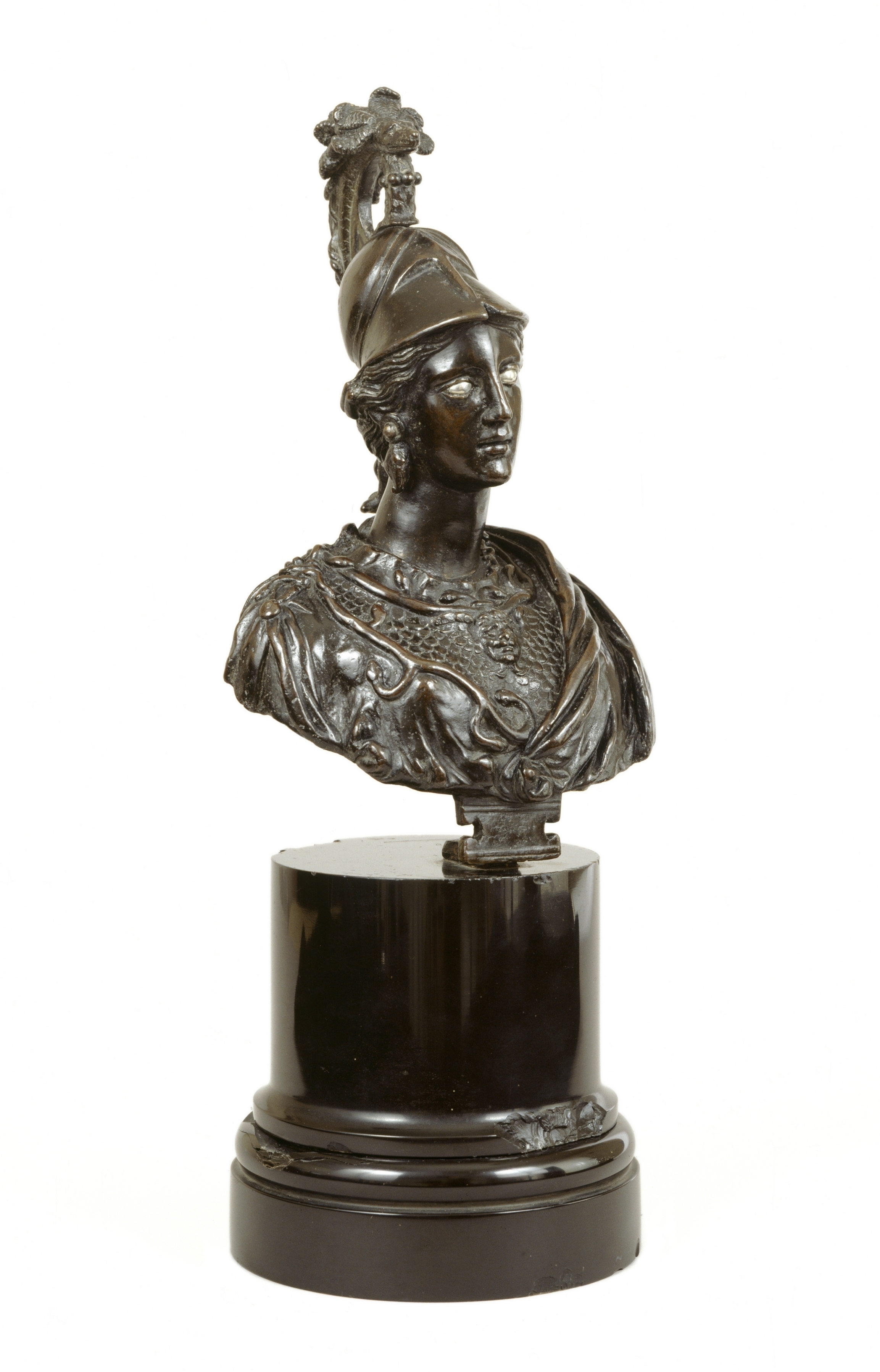 This bust was made by Aurelio Lombardi in the 16th century. Its silvered eyes make the piece appear more lively and before the introduction of electricity they would have sparkled brightly in candlelight. Wernher's interest in fine craftsmanship means that pieces in bronze appealed to him because it's difficult to make this dense, hard material appear flowing and realistic. Minerva was the Roman goddess of wisdom and war, which is why Lombardi has depicted her wearing a plumed helmet.