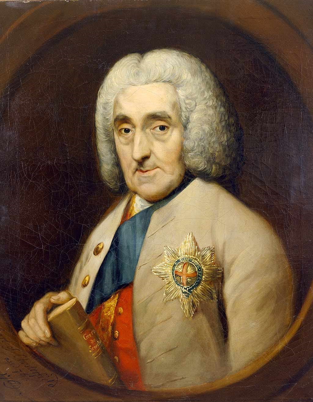 In this portrait, a copy of an earlier work by Thomas Gainsborough, Chesterfield is shown holding a copy of a bound philosophical essay by the Roman scholar Cicero. It's titled De Senectute (On Old Age) and is intended to show that Chesterfield was a wise and educated man. The star on his chest is the Order of the Garter, one of the most prestigious British chivalric orders, which was bestowed on him by King George II.