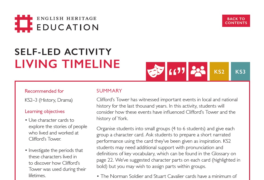 DRAMA - Choose a character from the history of Clifford's Tower and prepare a short speech reflecting their experience of York Castle. You could use the character cards in our Living Timeline activity to help inspire you and perform your speech in character.