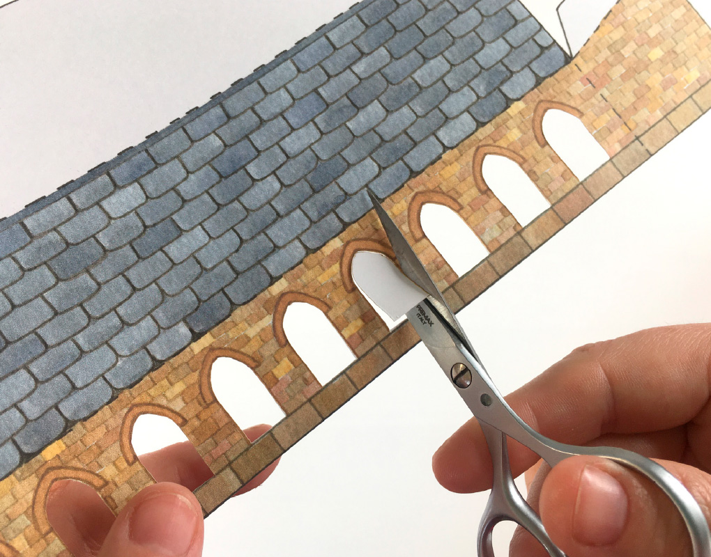 Cut out the exterior walkway (I). Using a small pair of scissors (nail scissors are ideal) cut out the windows.