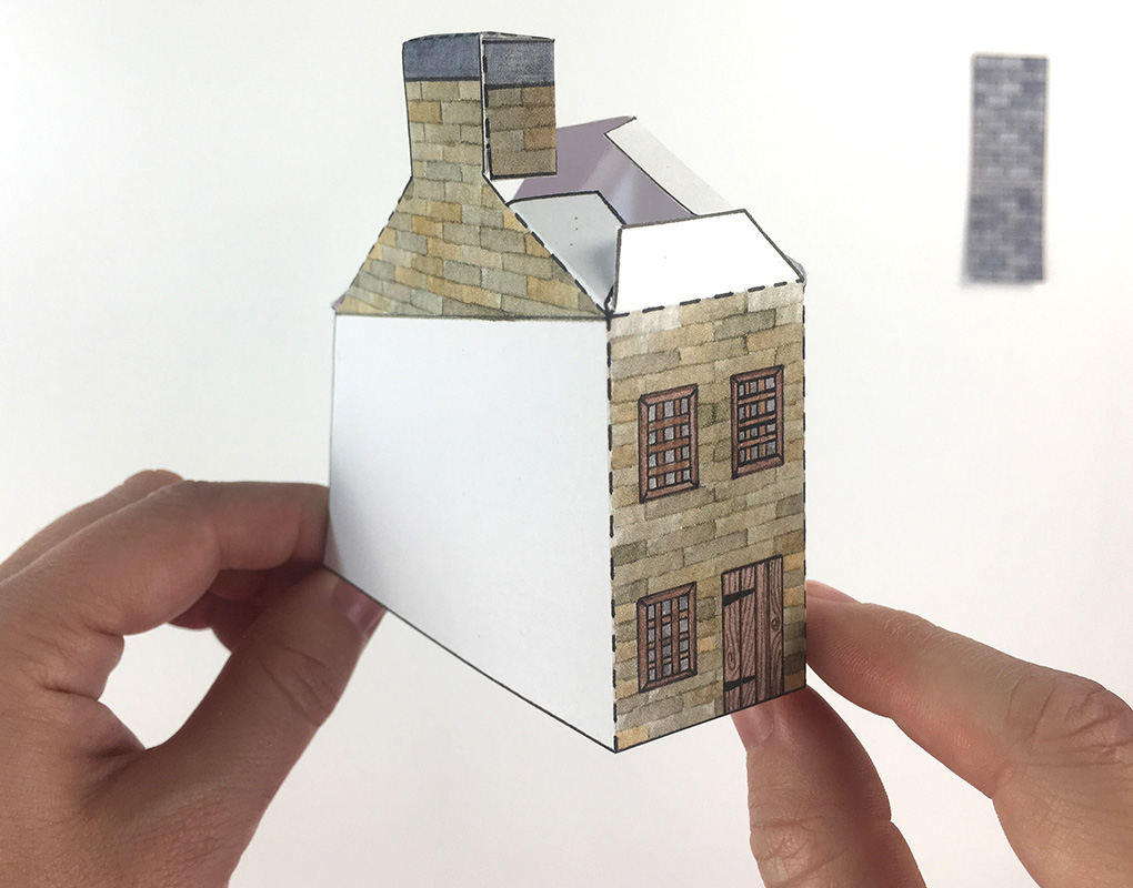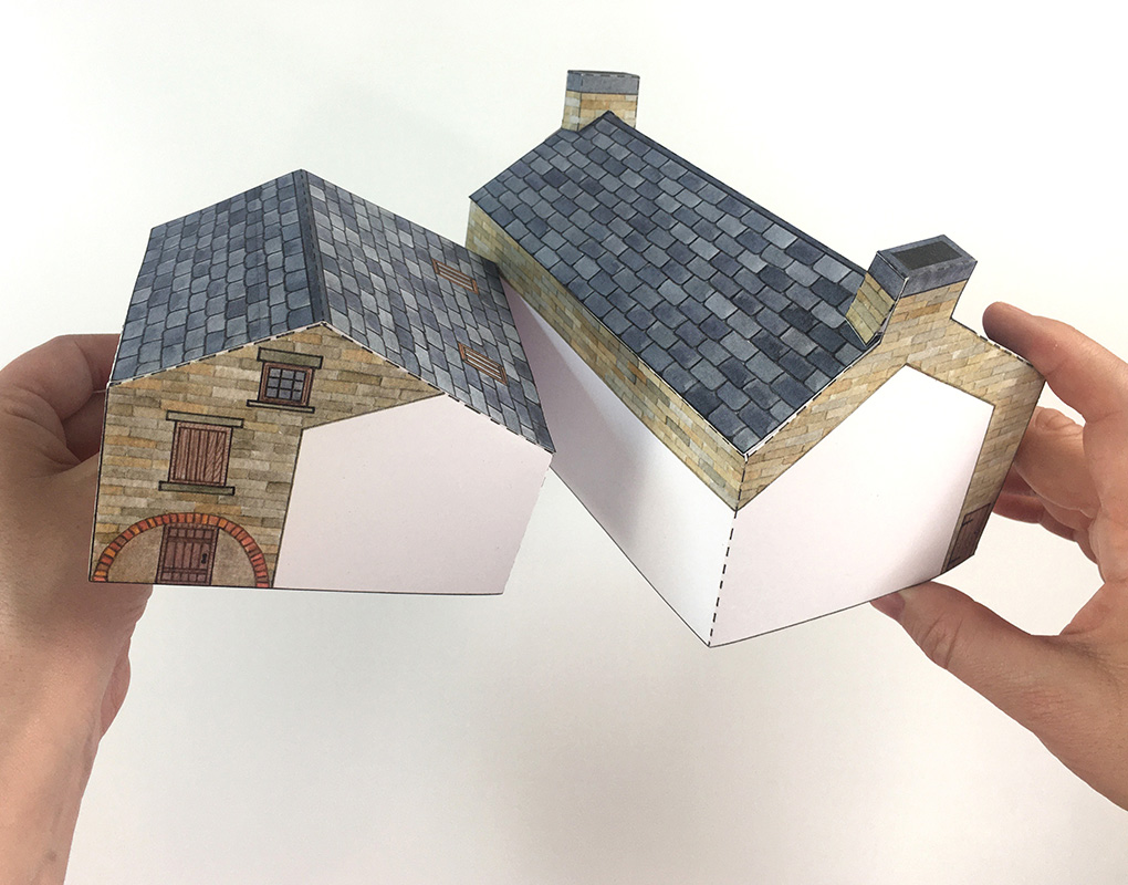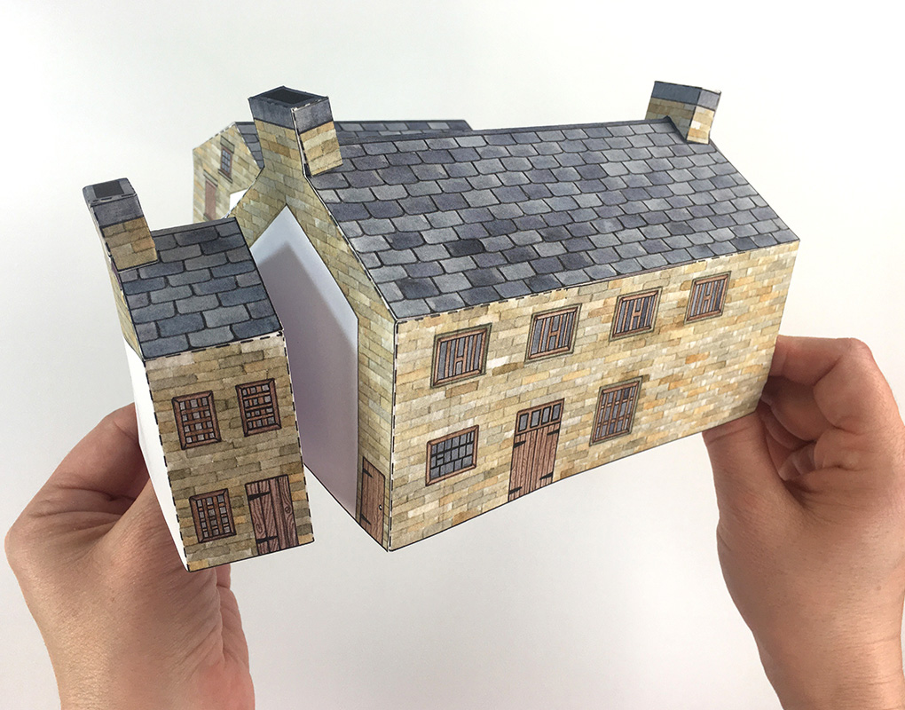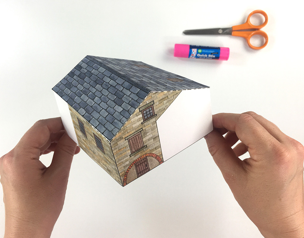 Fold B3 in half and glue to the tabs at the top of the walls to complete the boiler house.
