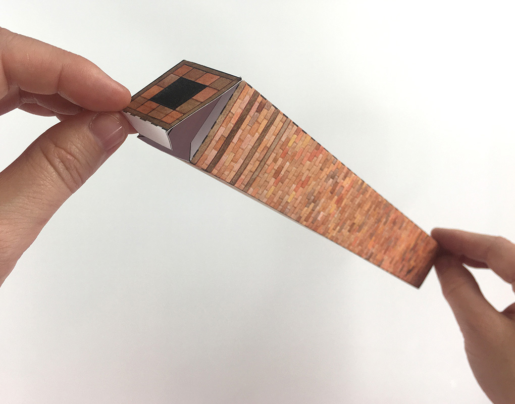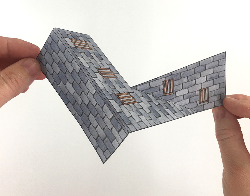 Fold along the dotted lines of C3 to create the roof. Mountain fold the long dotted line to create a roof shape, and valley fold the diagonal dotted line to create a V shape, as shown in the photo.