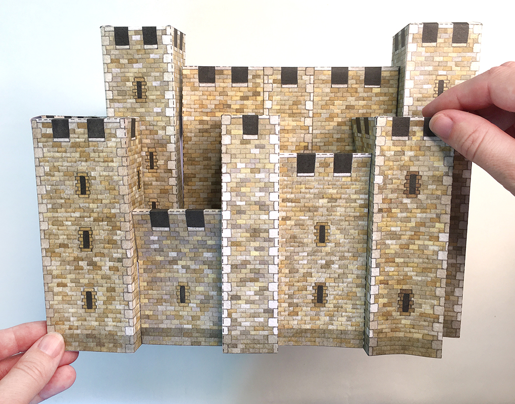 Now we need to join the four walls and the four towers together. The white areas on the towers correspond with the tabs on the side of the walls. Glue the walls on to these white areas. For extra strength, use tape as well. Work your way around until all the walls and towers are joined together.