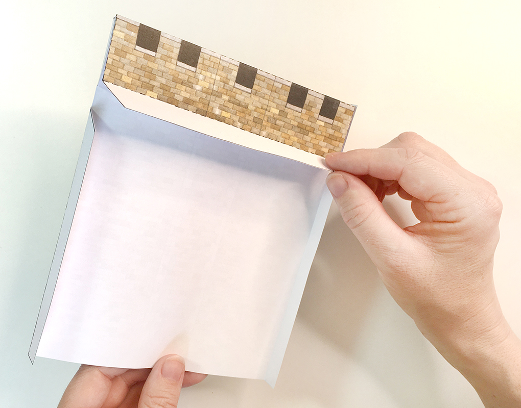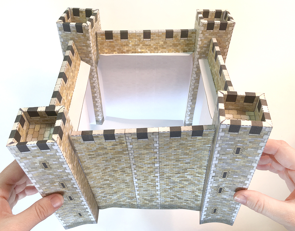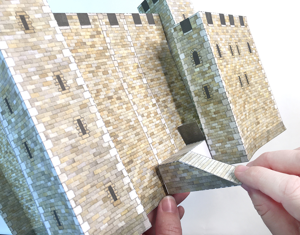 Put glue along the long horizontal tabs at the top of your castle walls and drop the roof in. You may find it helps to get your hand in underneath the model, so you can press the roof on to your castle walls. You’ll notice by adding the roof it’s become much sturdier.