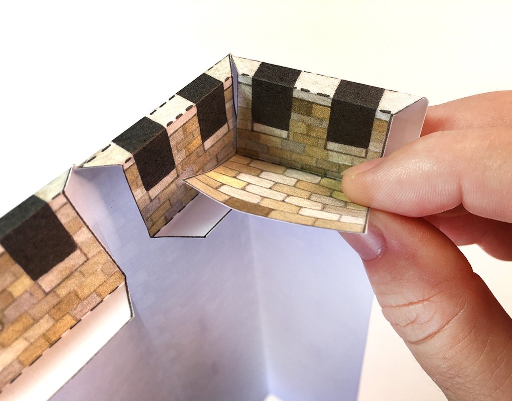 Next, we need to make the gallery that runs around the outside. Let’s start with part A, in the corner. Fold along the dotted lines and fold the lookout floor down to create a three-sided tower. Fold B the same way you did the castle walls, then attach B to A, using the white areas as a guide for where to stick.