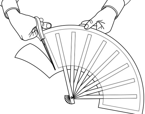 Coat one side of your sticks with glue and then stick them to the paper in the positions you marked out when your drew around them. Cut off the excess paper to form a fan shape.