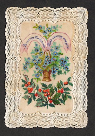 Christmas cards gradually became more popular. Newer printing technologies in the 1860s and 1870s reduced the price of cards and increased sales. Early Victorian cards were influenced by the older tradition of printed Valentine’s cards: both used paper ‘lace’ – embossed and pierced paper. Lace cards featured printed scenes of robins, Christmas trees, angels or children. Cards were influenced by changing fashions in art and design including the Pre-Raphaelite movement and Art Nouveau.