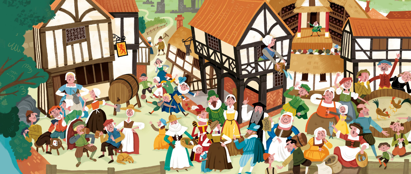 We've created a series of posters showing how people lived in England through the ages, like this one showing life in Tudor England.