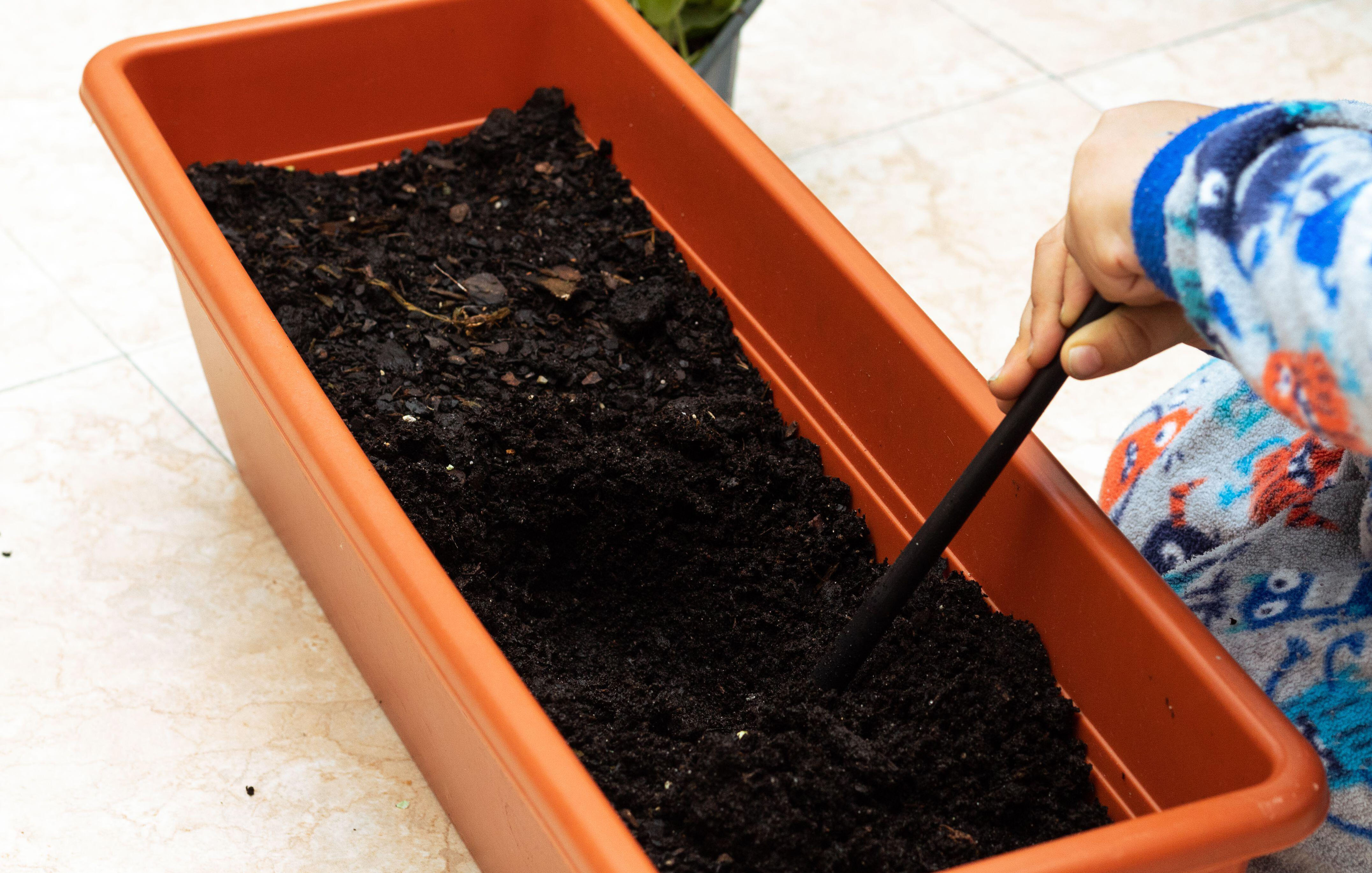 Add compost around it and pat it down gently. Repeat this for your other herbs to fill up the container - and make sure to fill up any gaps with more compost.