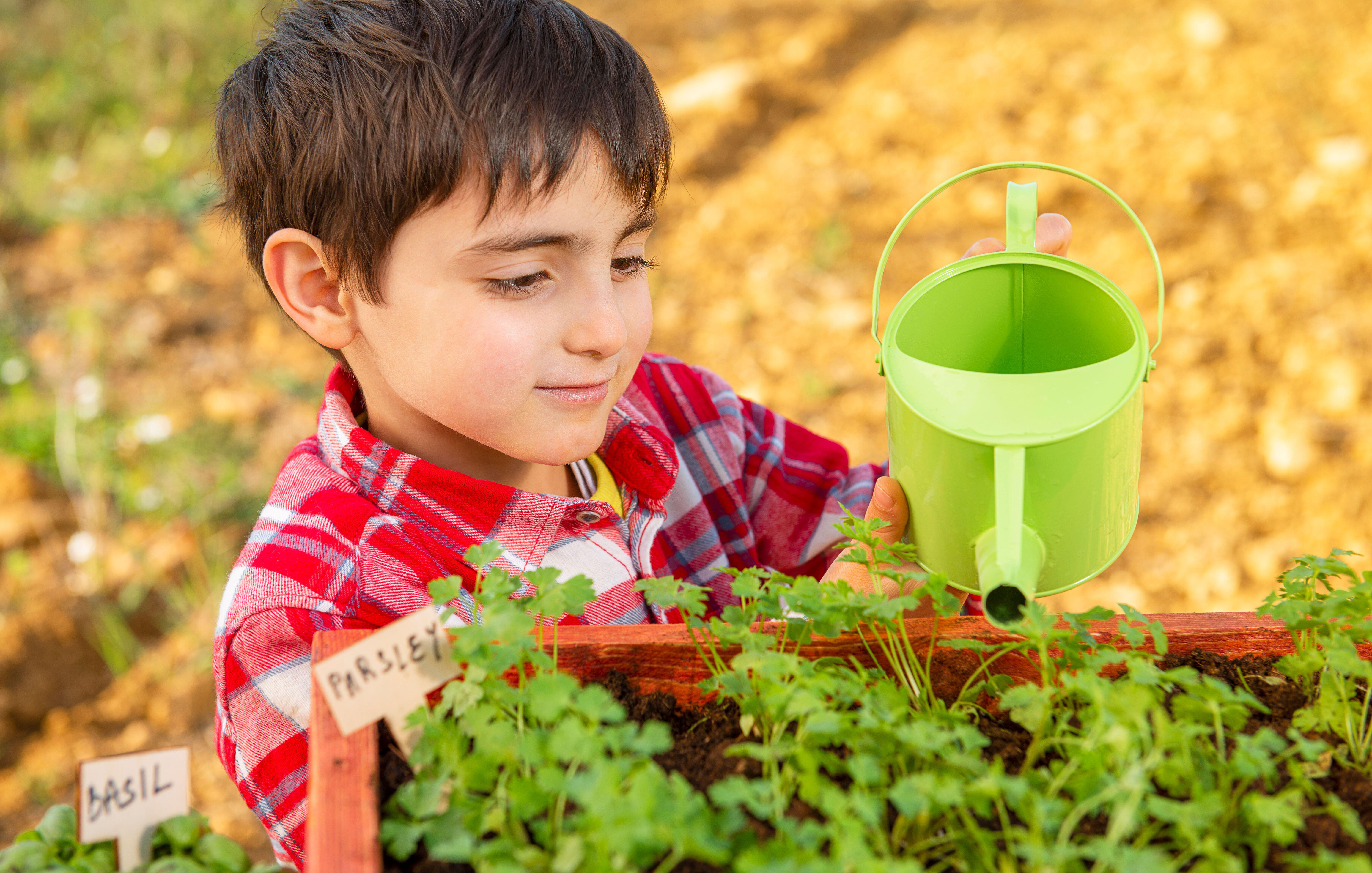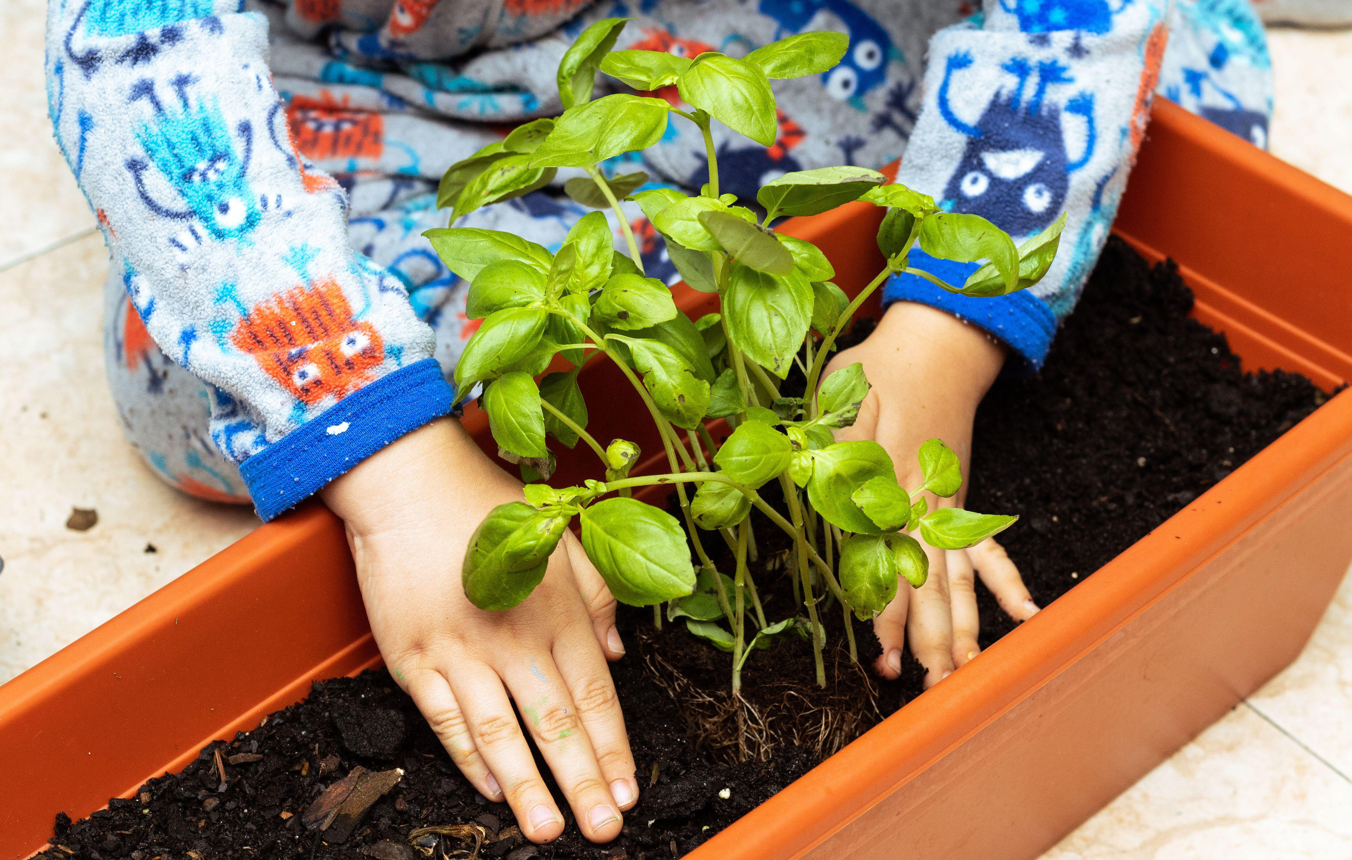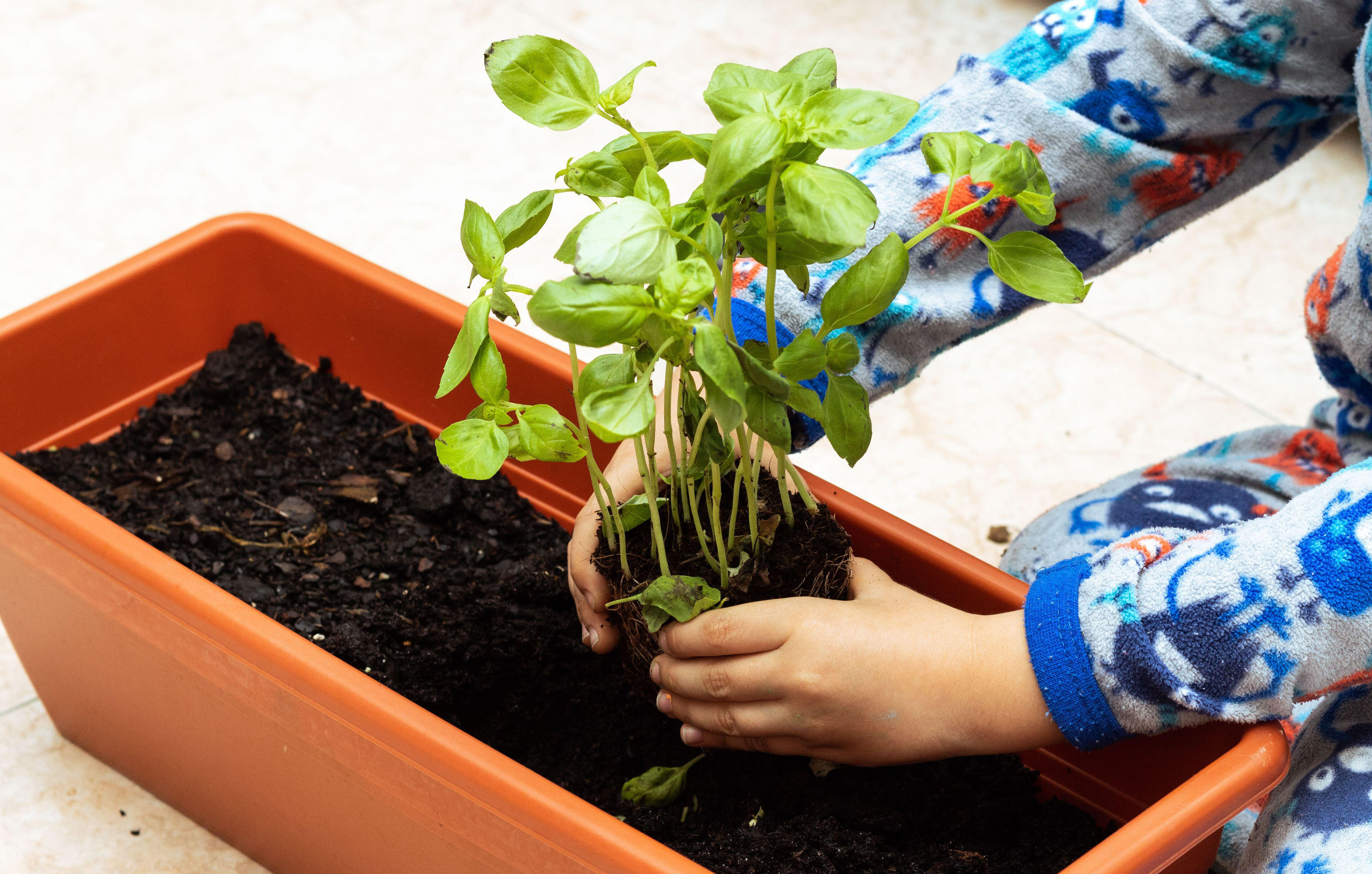 Place your herbs somewhere sunny to grow – ask an adult to help you if the pot is heavy! Water the plants carefully, until you can see water start to dribble out of the bottom of the pot. Make sure to check every day and water again if the compost feels dry.