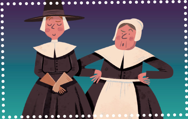 Text: Could you pass as a puritan? Image: two cartoon women dressed in black dresses with white collars