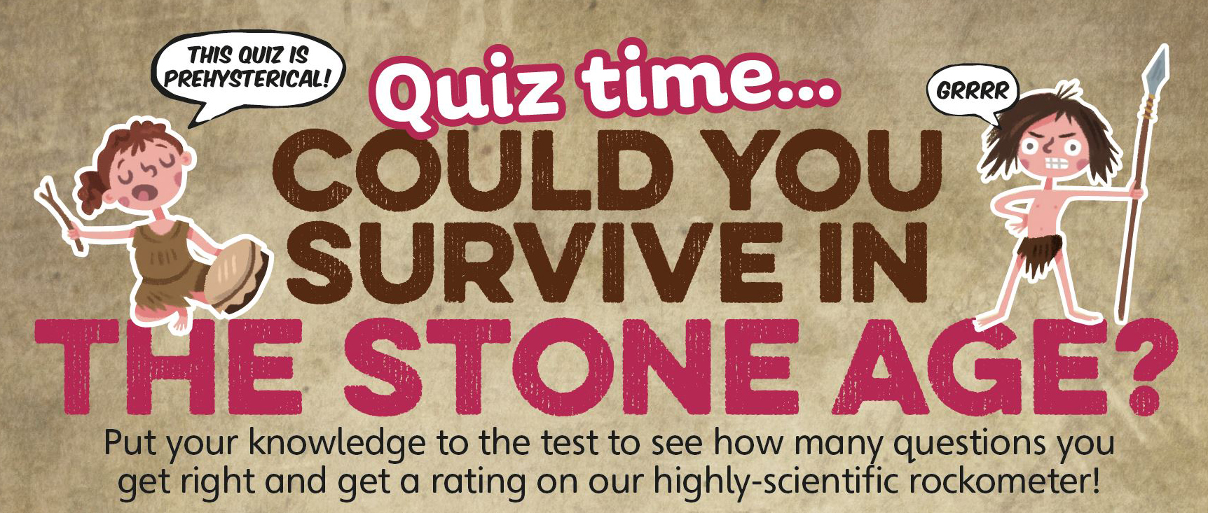 Congratulations on completing the quiz! Now that you’ve found out if you’d survive, download the full issue of our Kids Rule! Guide to Prehistory. From the end of the Ice age, travel through the Stone, Bronze and Iron ages and have fun learning all about prehistoric life. We’ve even added a few jokes to make you laugh along the way.