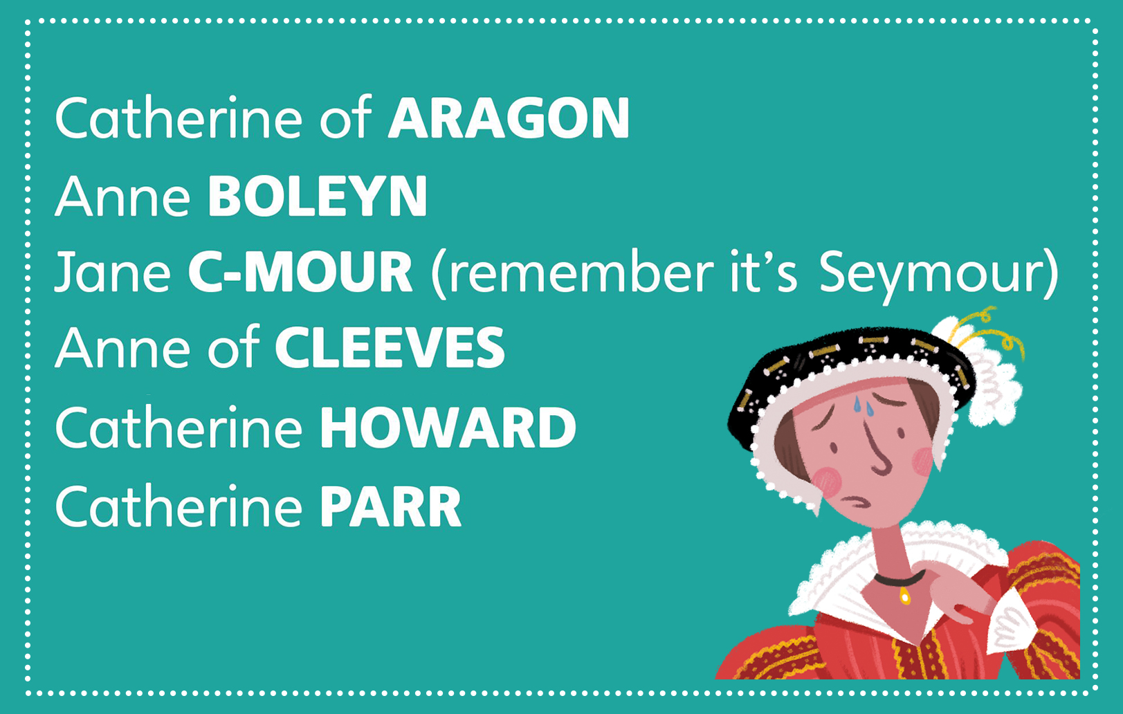 Can you name Henry VIII’s wives in order? If you add a sneaky spelling mistake it’s easy to remember as you can put their surnames in alphabetical order. See if you can recite them correctly in five minutes.