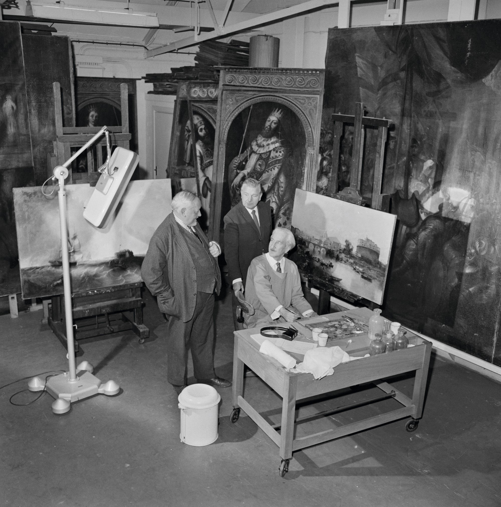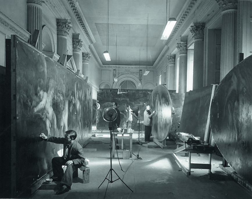By the 1950s, the Artists’ Section had in its remit some 3,000 paintings – works cared for today by English Heritage as well as Historic Royal Palaces, the Houses of Parliament, the National Trust, the Government Art Collection, Westminster Abbey, the V&A and the Royal Collection. The artists worked fast, either in situ in the case of paintings such as the Thornhill Ceiling at the Old Royal Naval College in Greenwich, or in makeshift studios such as the one set up in the Orangery at Kensington Palace to work on the Rubens ceiling murals from Banqueting House.