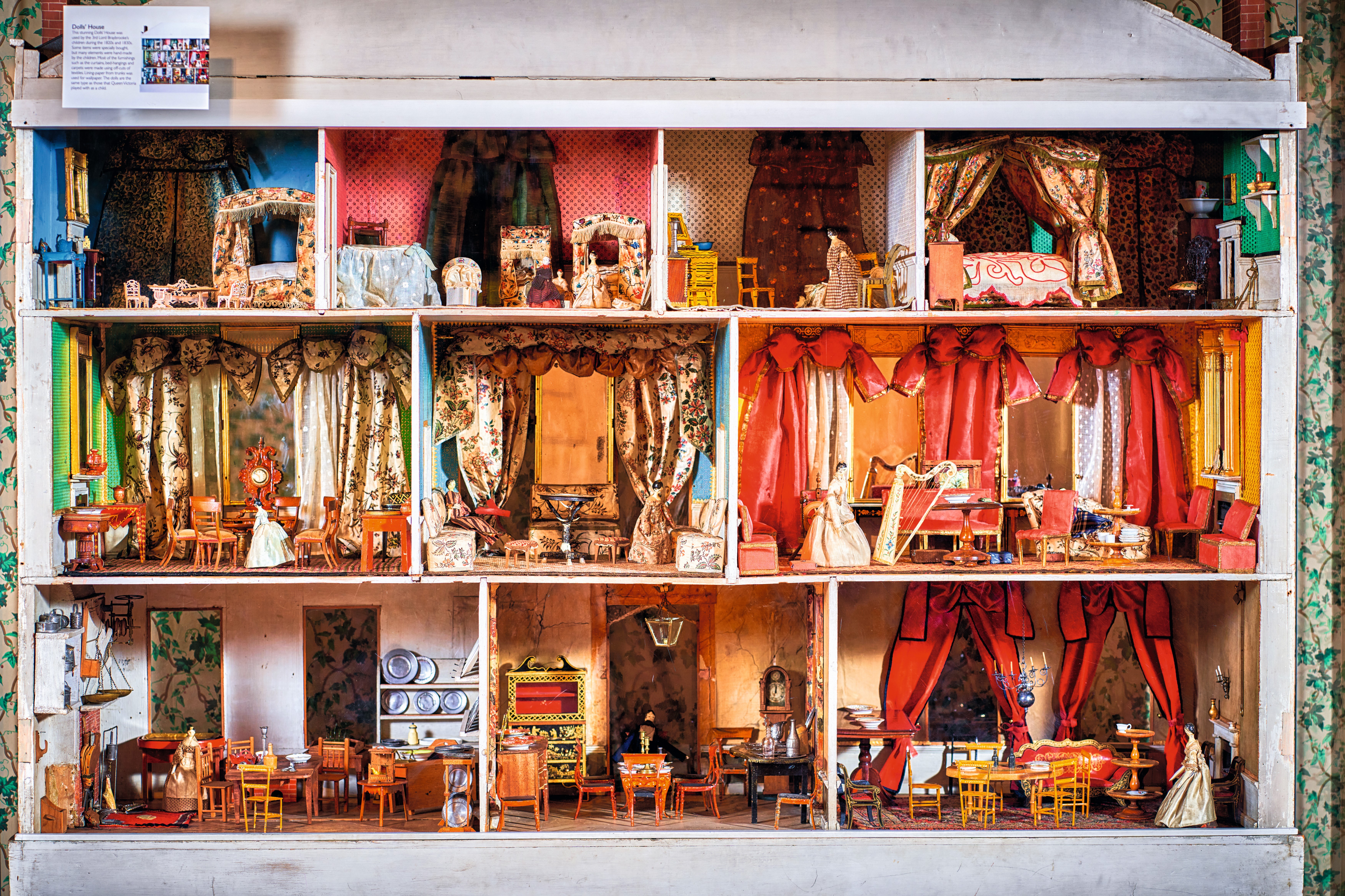 Among the treasures in the collection at Audley End House and Gardens is this rather grand dolls’ house. Measuring almost two metres across and consisting of 10 rooms, it was – and still is – the centrepiece of the nursery in which the 3rd Lord and Lady Braybrooke’s children spent many happy hours playing during the 1820s and 30s. The model house dates from the early 19th century and its dolls, decorations and furniture were mostly produced in the 1820s. Some pieces are believed to be later additions, suggesting that the children continued to adapt this cherished possession as they grew older. The construction is surprisingly simple. There is no staircase and the rooms are uncomplicated. However, the wallpapers are exquisite examples of Regency design, and several of the rooms are trimmed with borders of embossed gold paper.