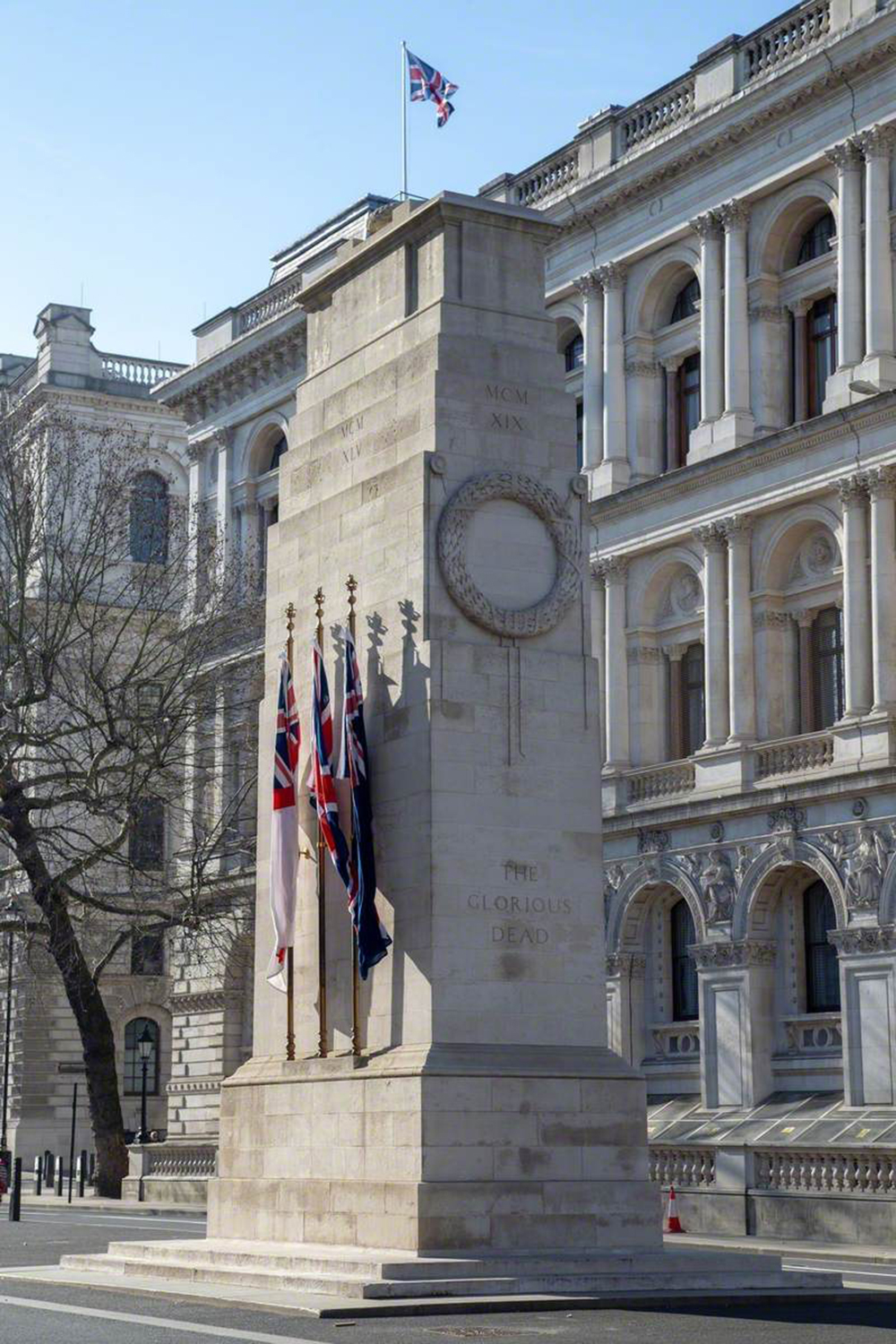 Lutyens wanted to have sculpted flags on the sides, rather than real ones, but in this one respect the government disagreed. As a result the Cenotaph is dressed with the flags of Britain’s armed services which are periodically renewed. Lutyens’s vision was of a monument that would be universal in its significance. The flags make it a national memorial, with specific military connotations. The Cenotaph can be read in both these ways – and in others.