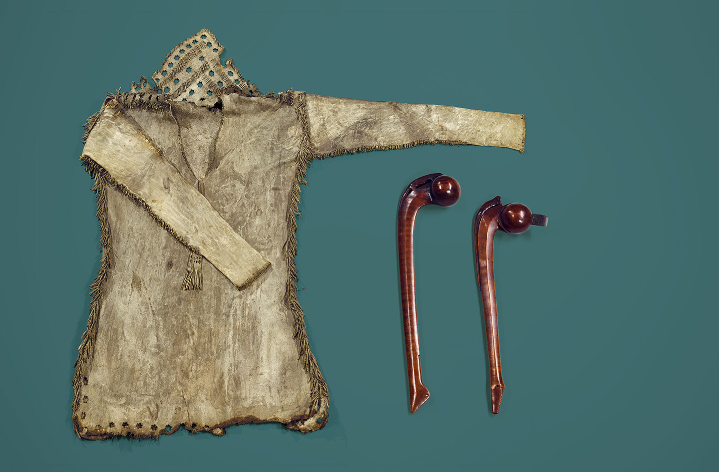 Audley End has been home to many generations of collectors over the centuries, and consequently the house today contains thousands of objects. In addition to the many works of European art and design on display, there are also some more unexpected artefacts from all over the world. Among these are a small group of incredibly rare items of Native American origin. A deerskin shirt, brought home by Richard Cornwallis Neville following his posting to the British military garrison in Montreal in 1840, exhibits the skill of the indigenous people of the Great Lakes in manufacturing textiles during the early 19th century. Garments such as this were collected by European military officers but very few survive today. Two ball-headed war clubs, which were brought to Audley End by Lady Jane Cornwallis following her marriage to Richard Neville, 3rd Baron Braybrooke, were originally collected by her grandfather, Charles Cornwallis, 1st Marquess Cornwallis. Recent examination of the iconographic carvings on the clubs indicates that they were used around 1781, during the American Revolutionary War, with one of them seeing action in 23 battles.