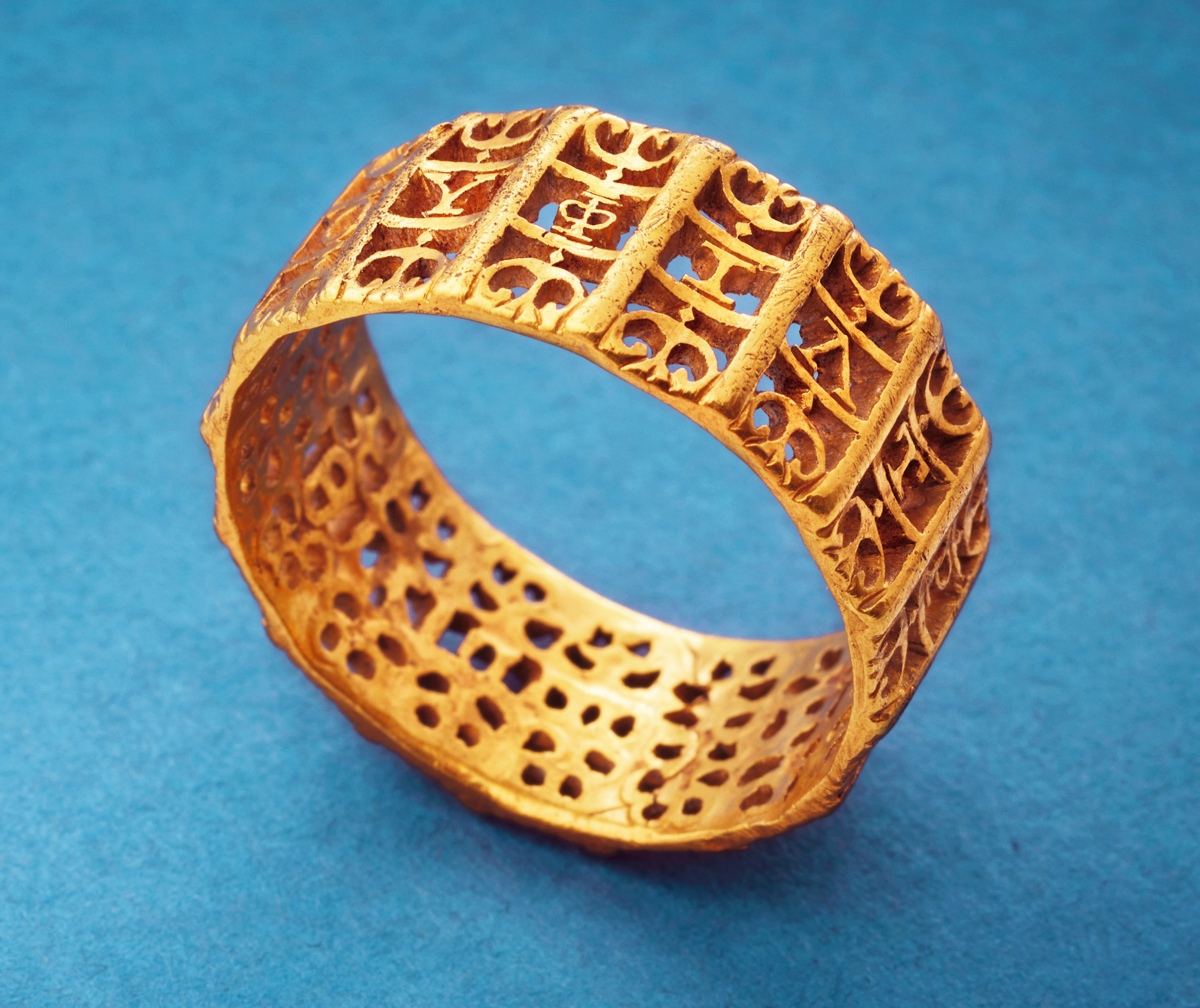 This intricate gold finger ring was found at Corbridge Roman Town. It is made of almost 12 grams of gold and has 16 facets, decorated with openwork peltas above and below a Greek inscription, ΠΟΛΕΜΙΟϒ ΦΙΛΤΡΟΝ, which translates as 'the love token of Polemius'. The wonderful craftsmanship means that the ring would have been a very expensive item and a specially commissioned piece. In Roman life, religion, belief and magic were intertwined, so this ring might be more than simply a statement of love. It could have been imbued with magical properties to aid Polemius in his search for love when he wore it. Greek was the language used in magical spells and charms, so it makes sense it would be used here. It is not known who Polemius was. He may have been a fourth-century citizen of Corbridge or perhaps he was visiting. Could he understand the Greek writing, or was it used for its efficacy in the charm? Perhaps he lived in the largest house found on site, with its painted wall plaster and underfloor heating. Whoever Polemius was, we know he had large hands, as the ring measures 27mm in diameter, much bigger than our largest modern ring size.