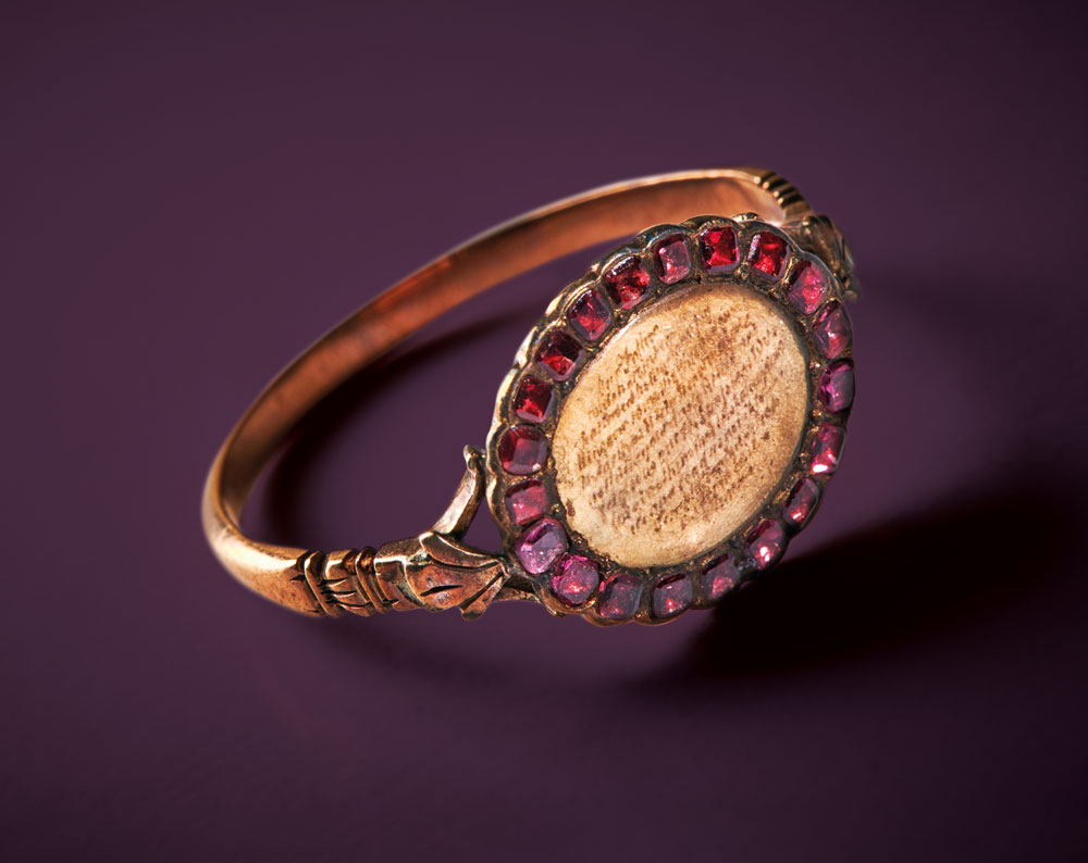 Beneath a crystal surrounded by garnets is a piece of vellum (parchment made from animal skin) inscribed in miniature with passages from the Lord’s Prayer. Probably created in the late 18th century, the ring is the product of collaboration between a goldsmith and a talented calligrapher.