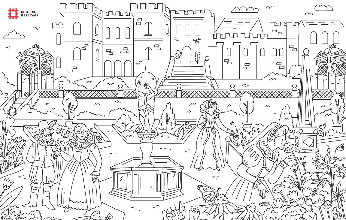 Create your own vibrant landscape with our colouring in sheet depicting an Elizabethan garden.