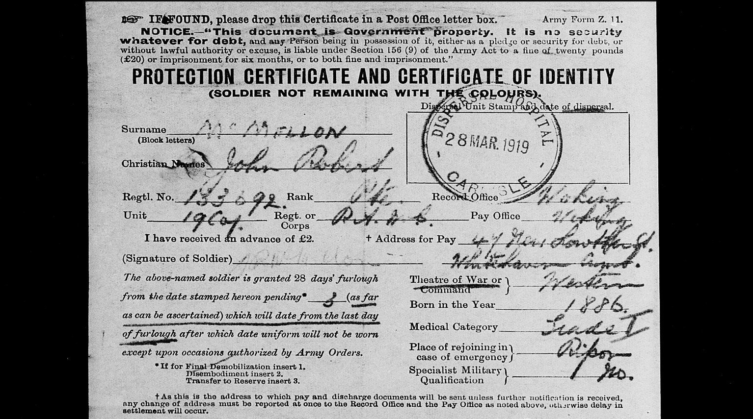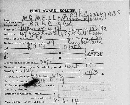 During his time in service, McMellon was awarded the 1914-1915 star, the British War Medal and the Victory Medal. He was discharged and pensioned in 1919. His pension provided 17 shillings a week with 5 of those earmarked as an allowance for his child.