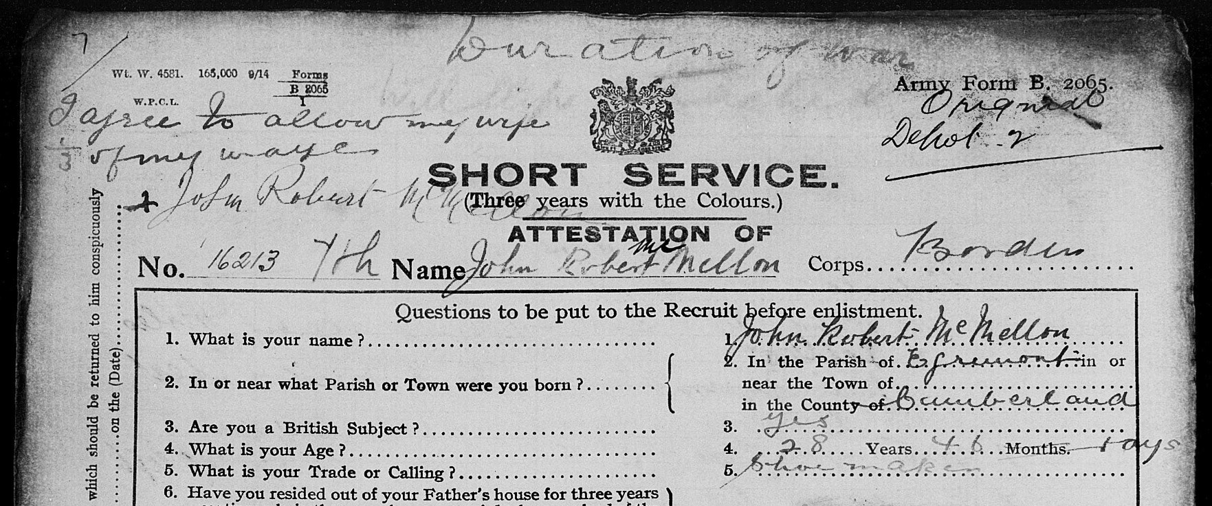 John Robert McMellon was born in Egremont Cumberland in 1886. He enlisted in the British Army at Carlisle in 1914, aged 28.