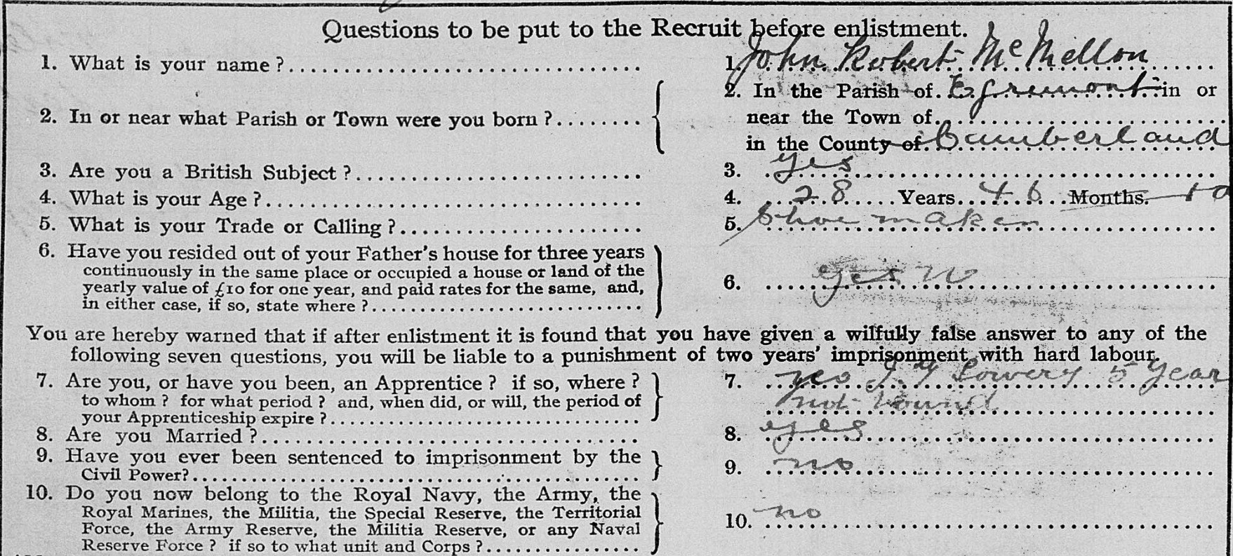 McMellon's peace-time occupation was a shoemaker. He was apprenticed for 5 years under J.J. Lowery. During his time in the British Army he was promoted to Lance Corporal in May 1915 and then Sergeant in July 1915.
