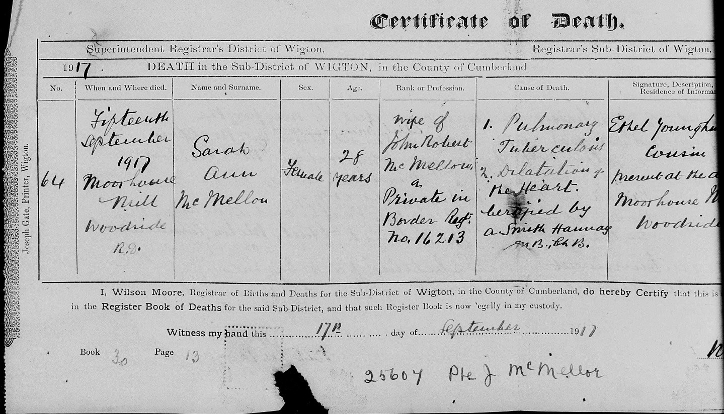 While he was serving, McMellon suffered heartbreak close to home, when his wife Sarah died aged only 28 from pulmonary tuberculosis on 15 September 1917.