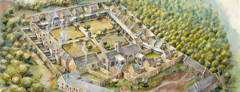 Reconstruction drawing of lay brother bringing food to a monk’s cell by Ivan Lapper © Historic England Photo Library