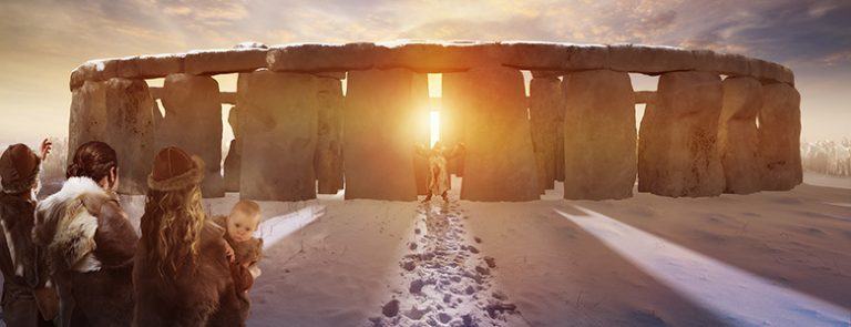 Top image: Reconstruction showing how Stonehenge might have looked at sunset on the winter solstice in about 2200 BC. © Historic England (drawing by Peter Lorimer)