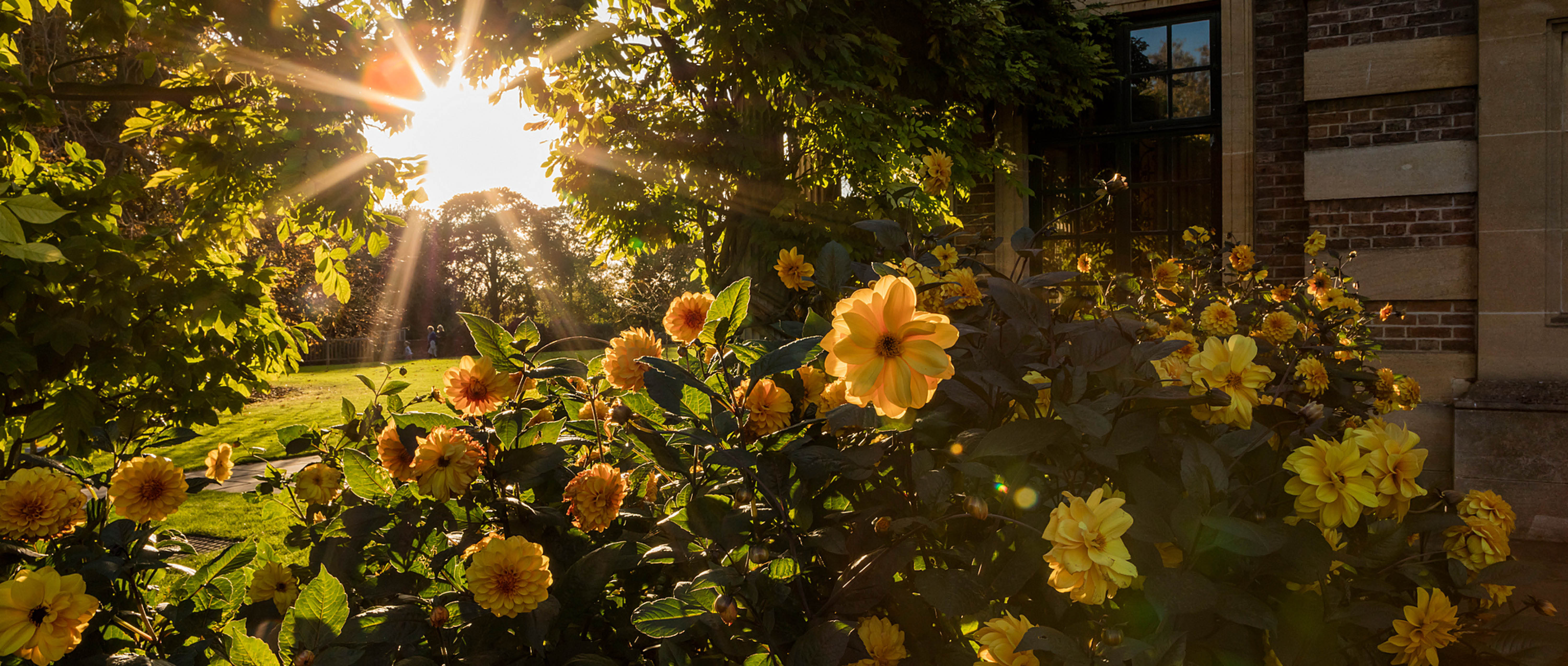 An orange dahlia flower glows in the autumn sunshine in the gardens outside Eltham Palace.