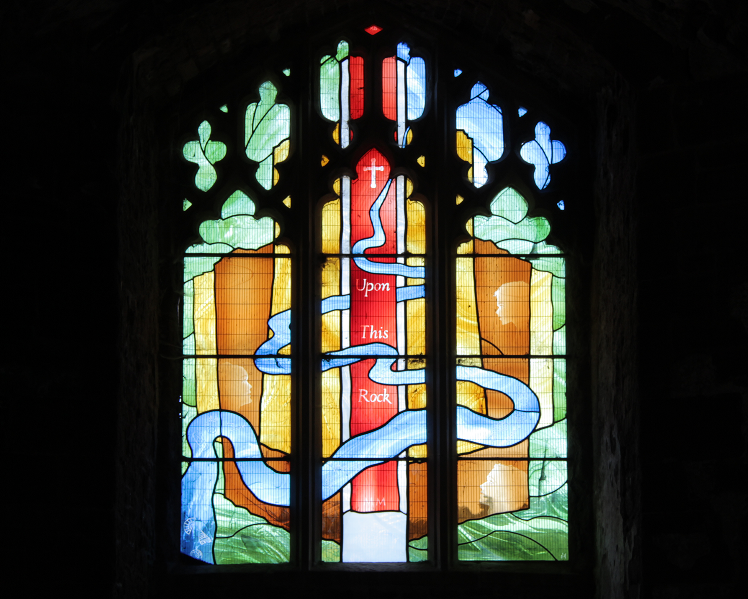 In the Chapel, find the beautiful stained glass window that was installed to mark the new millennium in the year 2000. Nicola Hopwood's design features the rock on which the castle stands, as well as the meandering River Wye. Three faces symbolise the three parish communities of Goodrich, Marstow and Welsh Bicknor.