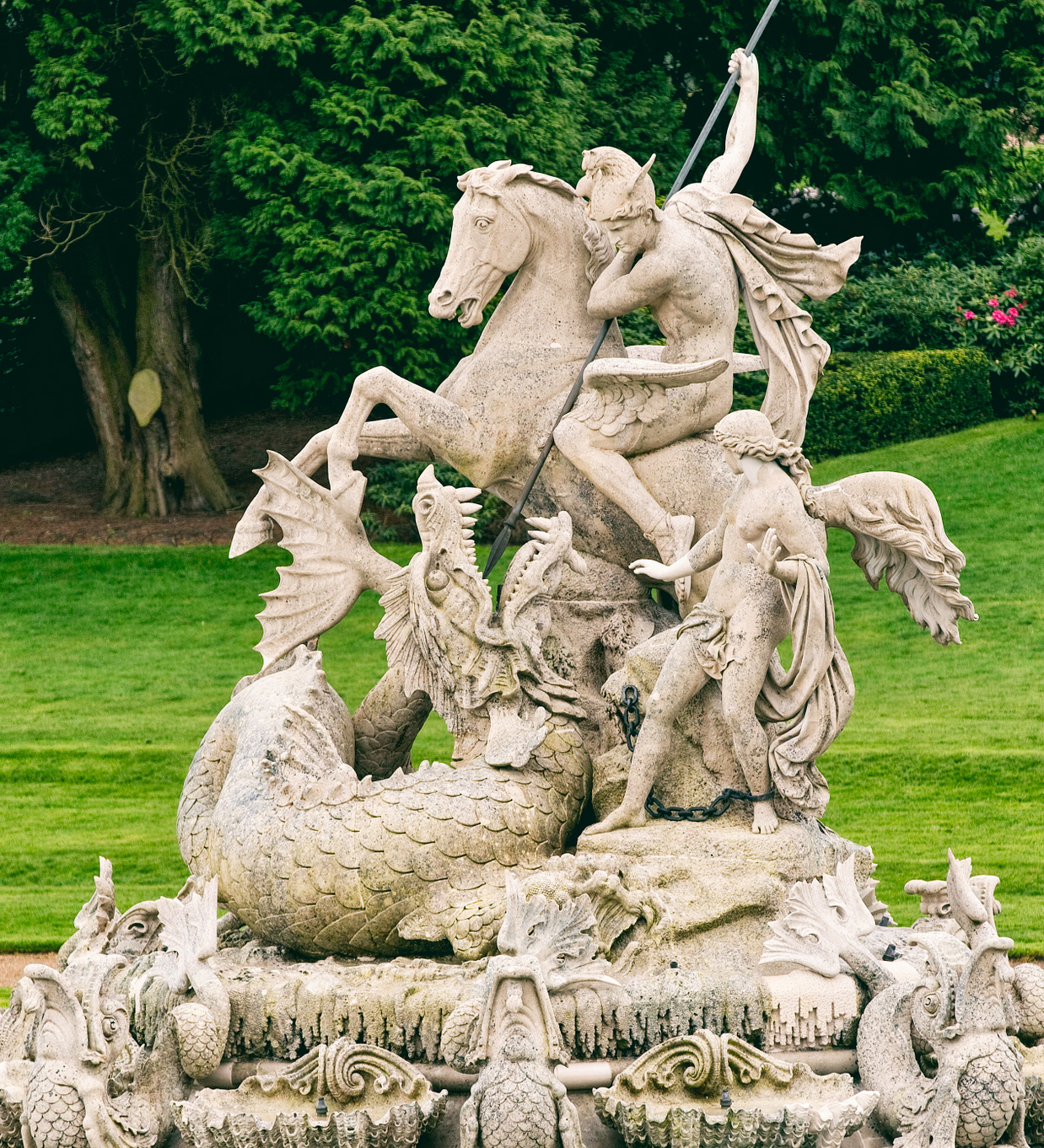 Witley's impressive fountain depicts a well-known scene of Greek mythological heroism. When the vain queen Cassiopeia of Ethiopia claimed that her daughter Andromeda was more beautiful than the sea nymphs, Poseidon was angered and unleashed the sea monster Cetus to devour her. The monster slayer Perseus came across Andromeda in distress, and is seen spearing the sea monster from his winged horse to save the beautiful maiden from her fate.