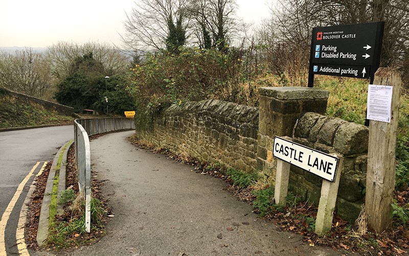Come out of Bolsover Castle and follow the road round to the right, then turn right again down Castle Lane. The road curves down and around the hill - as it turns back round to the left, follow the footpath sign through the trees, along the tarmac path off to the right.