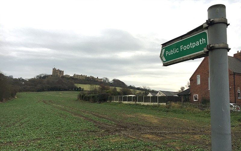 You'll come out at an open field with Bolsover Castle above on your right. Turn left down the hill and follow the path parallel to the hedge until you get to the bottom of the field.