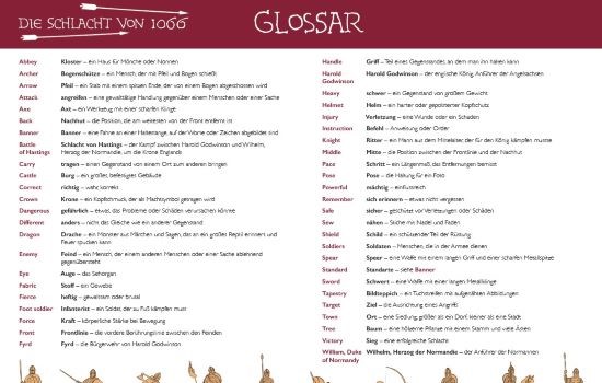 The accompanying glossary to our Battle Abbey Battlefield 1066 Trail, translated into German, French and Czech.