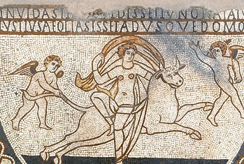 One of the finest among them is the Helicon mosaic, which comes from an apsidal room excavated in the 19th century. This very fine pavement dates to the early 4th century AD and includes an unusual Greek inscription in blue glass tesserae. It would have formed the floor of an apse at one end of a dining room, in a position allowing the principal guests to view and admire it from their seats or couches, while eating and talking.