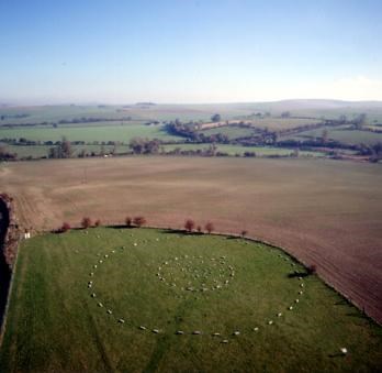 Aerial view of Avebury showing the stone circle, church and neighbouring Alexander Keiller Museum