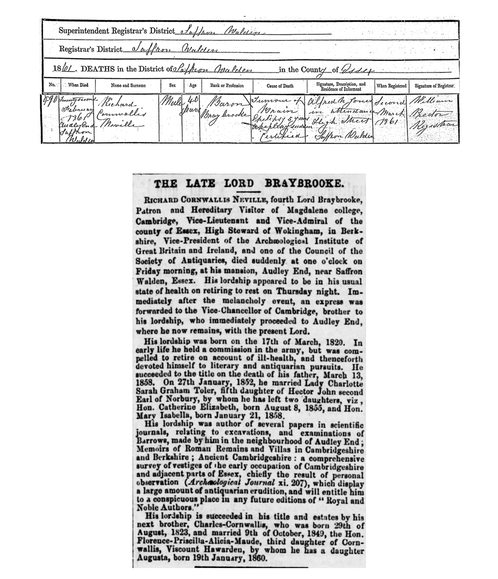 Baron Braybrooke for just under three years, Richard deserves to be recognised as an individual who has left an important legacy, and not only in the rooms and on the walls at Audley End. His contribution to the knowledge and understanding of ancient Cambridgeshire and Essex with regard to Roman, Romano-British and Anglo-Saxon life is particularly notable. Visitors to Saffron Walden Museum can view exhibits displaying objects he was responsible for excavating.