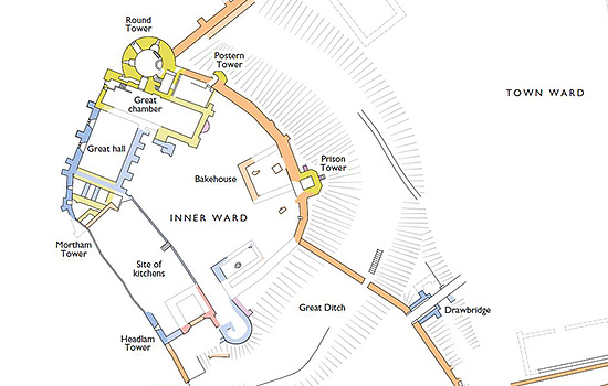 The first castle took the form of a ringwork, an enclosure of ditches and banks protecting the south and eastern sides, with the high cliffs forming the north and western defences. This early castle, whose site is now occupied by the inner ward, contained a stone gatehouse, but was otherwise a timber structure.