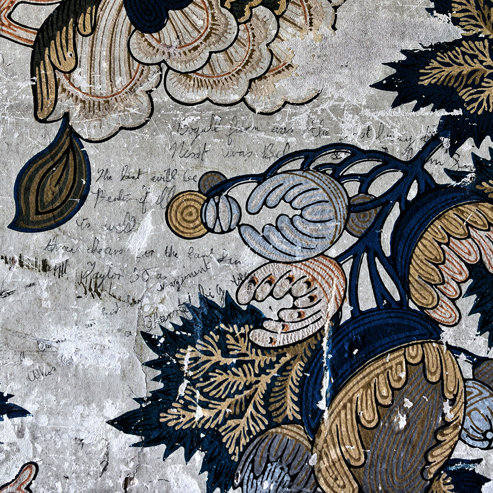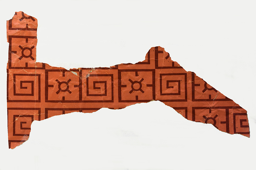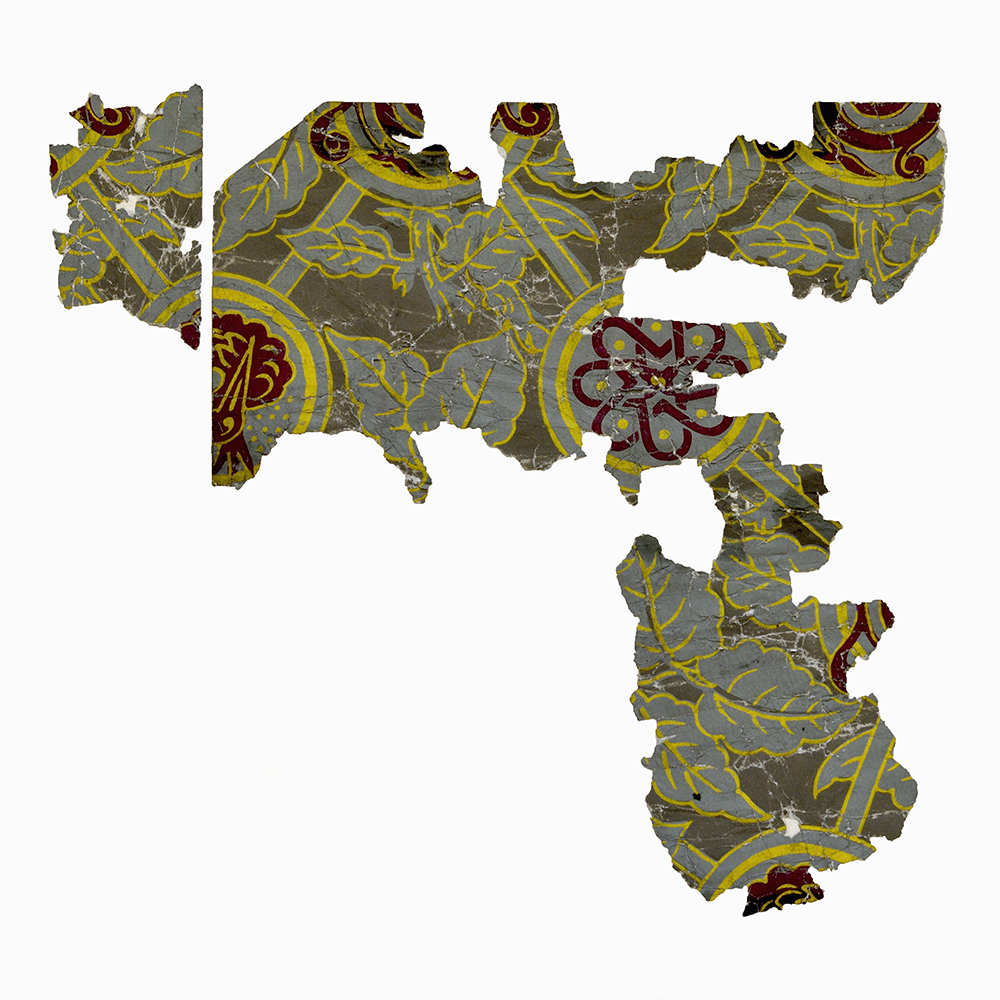 A wallpaper fragment that was discovered within a wall cavity on the mezzanine corridor. An identical sample was also found in floor rubble in the adjacent room to the Estate Office, previously a toilet area.