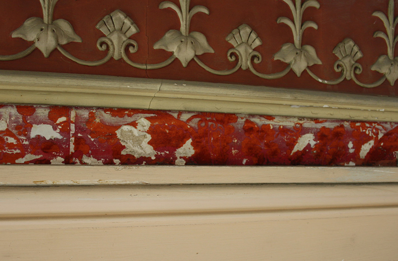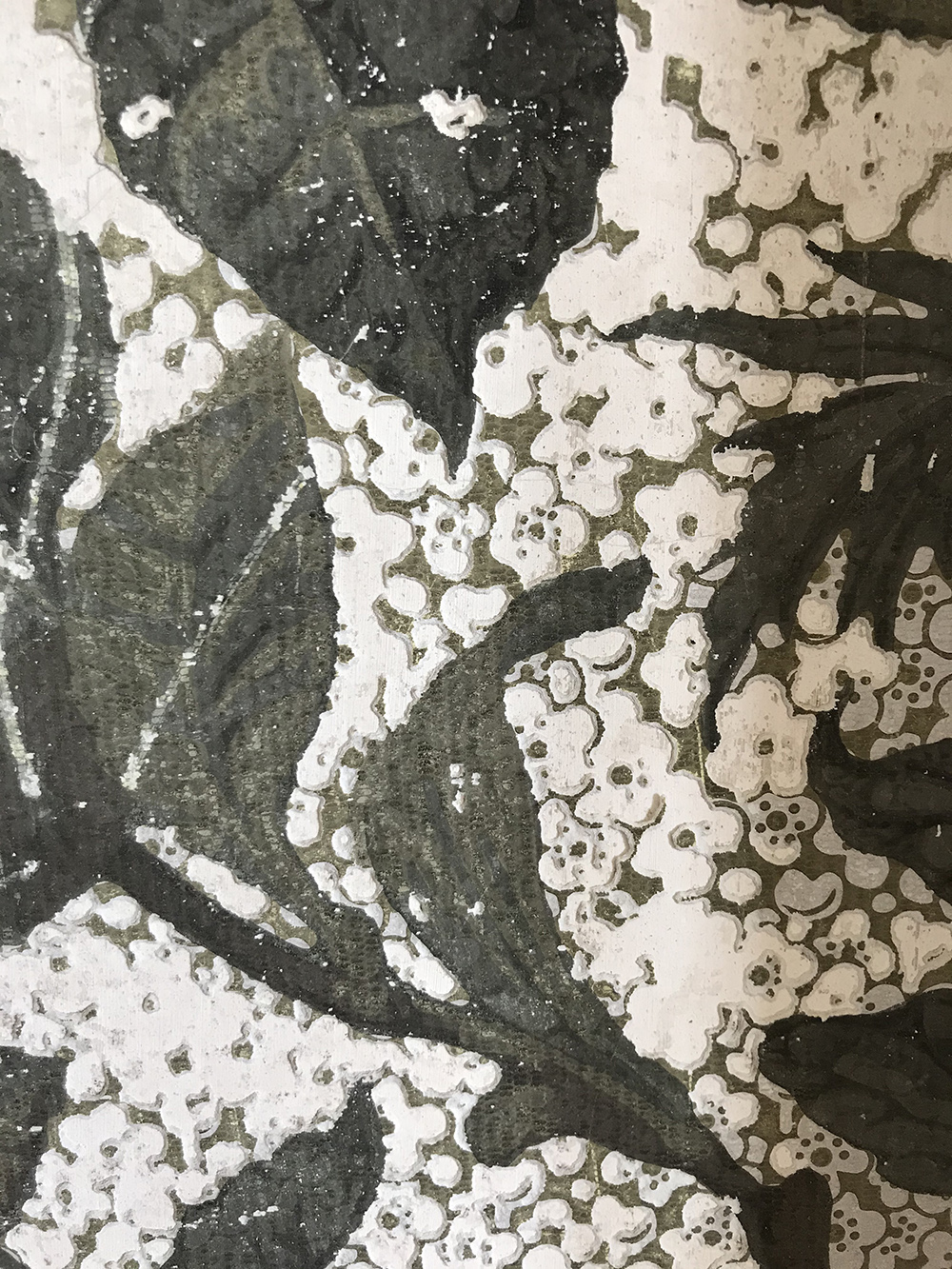 Small sections of the overpaint have flaked off to reveal what may be olive green and mandarin blue pigments in the original wallpaper, supporting the identification.