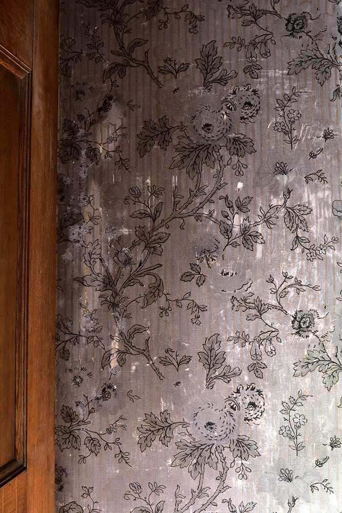 A damask-effect wallpaper in the Principal Bedroom dating from the 1900s to 1920s. Just above the dado level some of the original white pigment has been lost revealing a discoloured yellow/brown paper underneath.