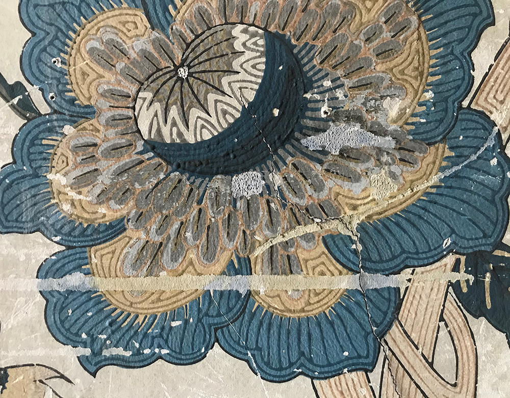Fresh surface scratches and small areas of damage have been painted in and toned to match the wallpaper using watercolour pigments. Some sections were able to be washed with distilled water to improve their appearance and in some cases, paper fragments were lined with an internal support of Japanese tissue and either reattached to the wall or placed in archival storage.
