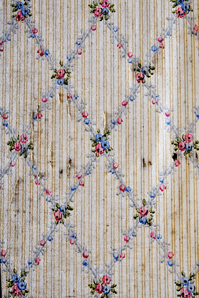 A detail of the flower wallpaper in one of the servants’ rooms showing a white background stripe with a blue, pink and green floral trellis.